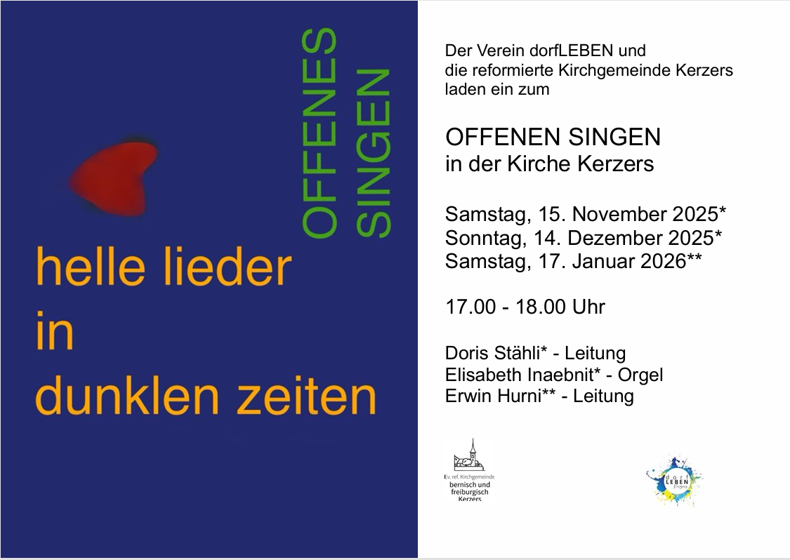 laden ein zum Offenen SIngen in der reformierten Kirche Kerzers. Keine Anmeldung notwendig, Kollekte.