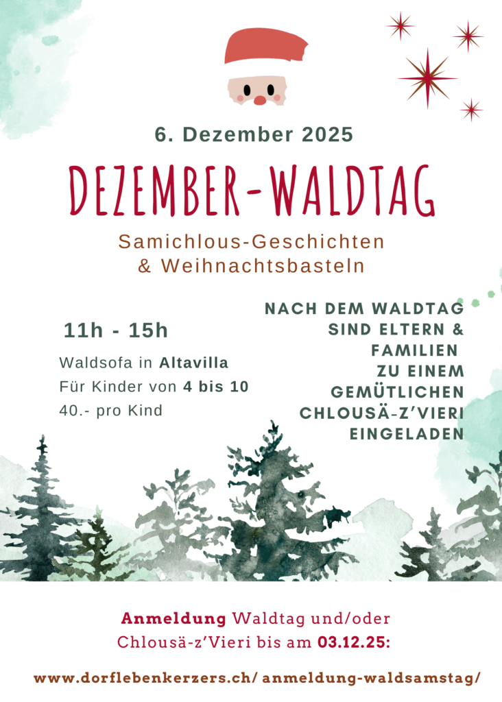 Wir lauschen spannenden Samichlaus-Geschichten und basteln etwas für Weihnachten. Im Anschluss laden wir Eltern, Familien und Freunde zu einem gemütlichen Chlousä-z’Vieri ein. Und wer weiss, vielleicht finden wir ja noch die eine oder andere Chlousä-Spur im Wald? Anmelden